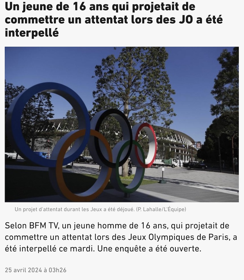 昨晩、フランスのメディアが大きく取り上げていたのが、ついにという感じの、オリンピックがらみのテロ事件関連の話題。