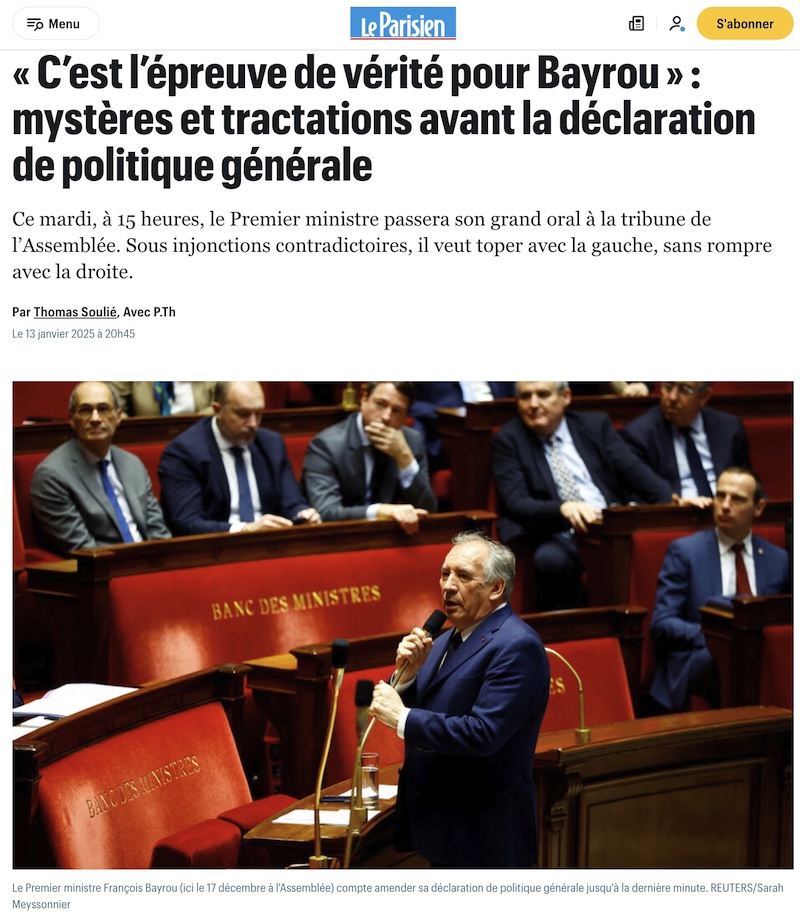 本日、フランス時間15時から、バイルー新首相が所信表明演説を行う。年末年始のため、首相になってから1ヶ月近くたったが、初めて公に新政府の方針を発表することになる。先週には労働組合の代表とも会合をもつなど、いろいろな勢力との落としどころを探っているようだが、フランスのメディアでは、所信表明演説の内容については、確実な物は流出していないようだ。