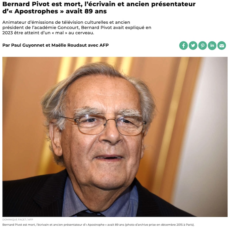「ベルナール・ピヴォ逝去。作家であり、“アポストロフ”の元司会者は89歳だった。」