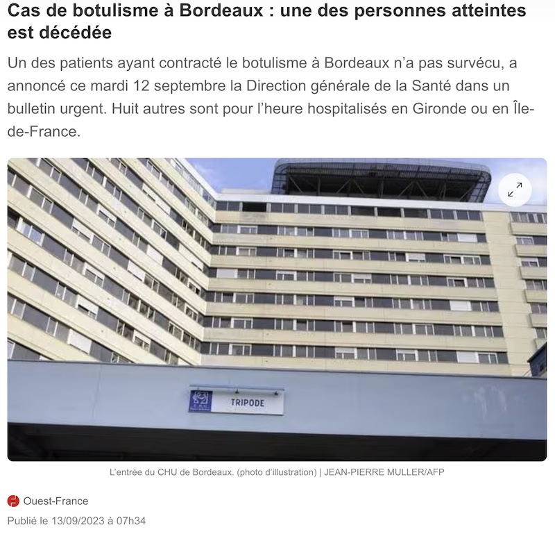 これは先週末、ボルドーのバーで、大多数が外国人旅行客(アメリカ、カナダ、ドイツ)がボツリヌス菌食中毒で緊急入院したうちの一人で、まだ8人が入院しており、そのうちの7人が危篤状態か重体だという。