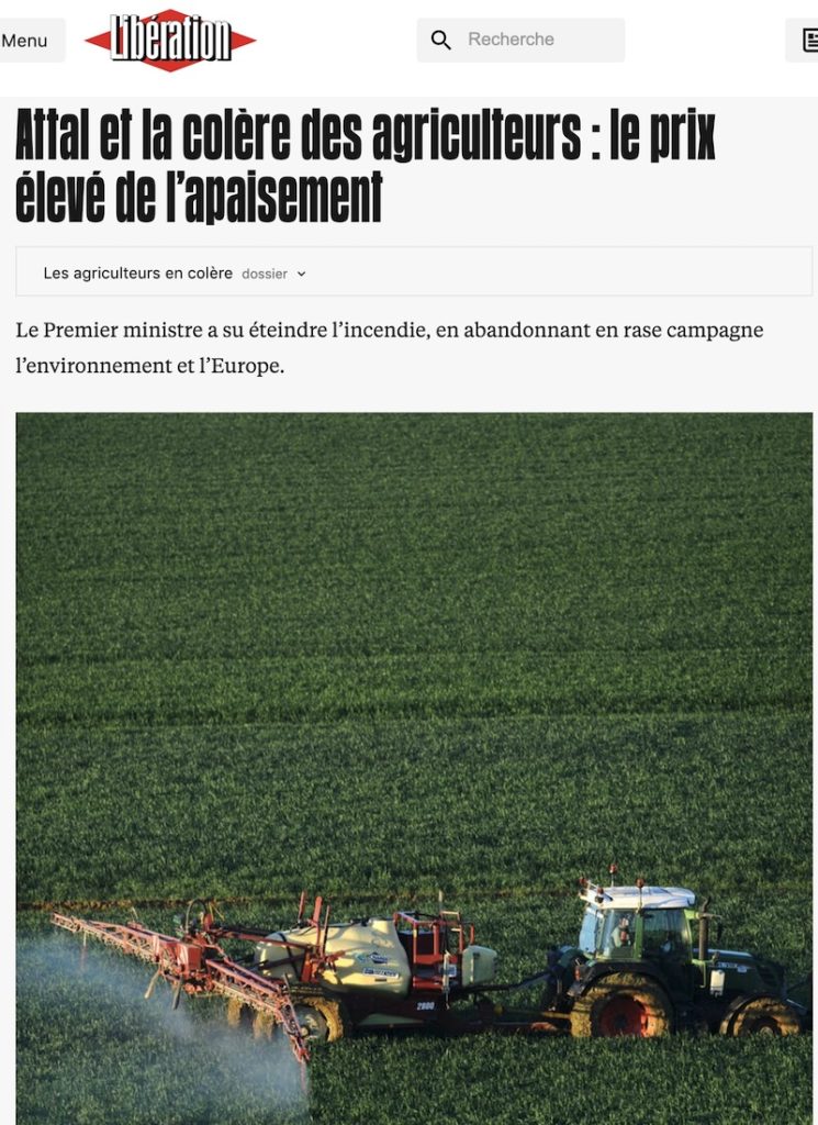 木曜日、フランスのアタル首相は、この一週間で3度目となる会見をして、二週間以上続いているフランスの農業従事者の怒りに対して、前回の発表ではまだ不充分とされた提案をさらに具体的にして、1億5千ユーロの追加予算を割いて、フランスの農業従事者の支援をするとした。さらには、2024年、この農業支援などに使われる予算は4億ユーロにもなるという計算もあるが、政府は元々予定していなかった予算枠で、かなり高くつくことになった。