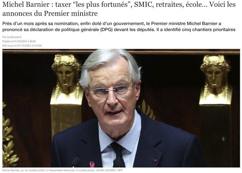 「ミシェル・バルニエ:“富裕層”増税、最低賃金、年金、学校など。首相の発表から」