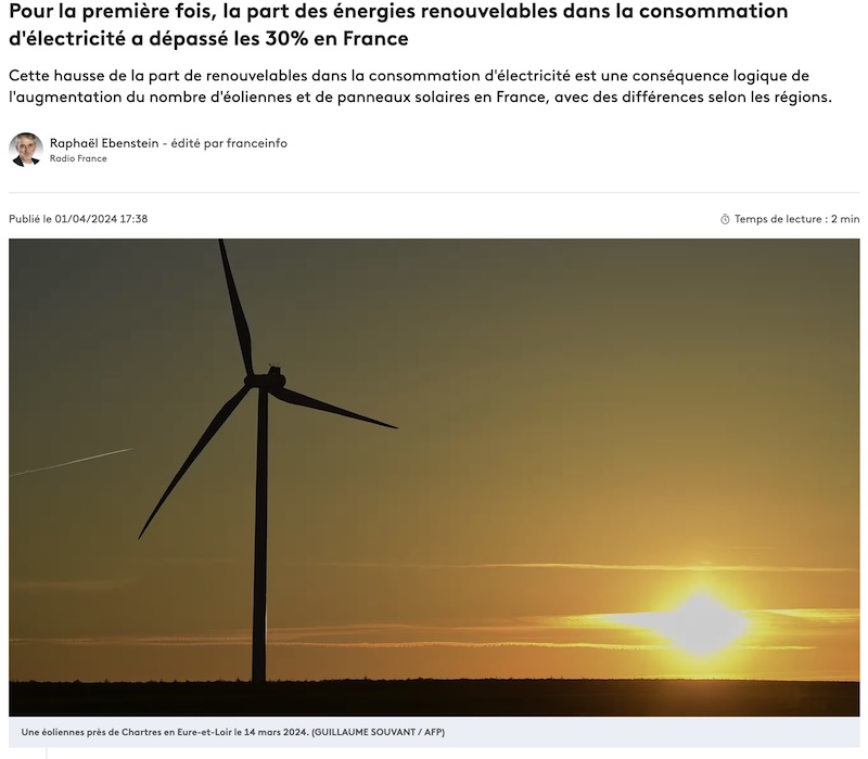3月29日に発表された2023年の電力消費の報告によると、フランスの電力消費で初めて、再生可能エネルギーの割合が30%を超えたという。