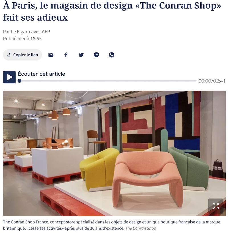 今週、30年以上、パリのボンマルシェの横で営業していて、日本人の観光客や住民にも人気だったザ・コンラン・ショップが閉店した。ロンドンから始まった店舗ではあるが、デザイン性の高い家具や雑貨などで、パリの店も人気だった。