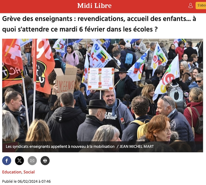 フランスの農業従事者の怒りはいったん落ち着いたが、2月1日に行われた教職員のデモ・ストライキが、本日も引きつづき行われる。