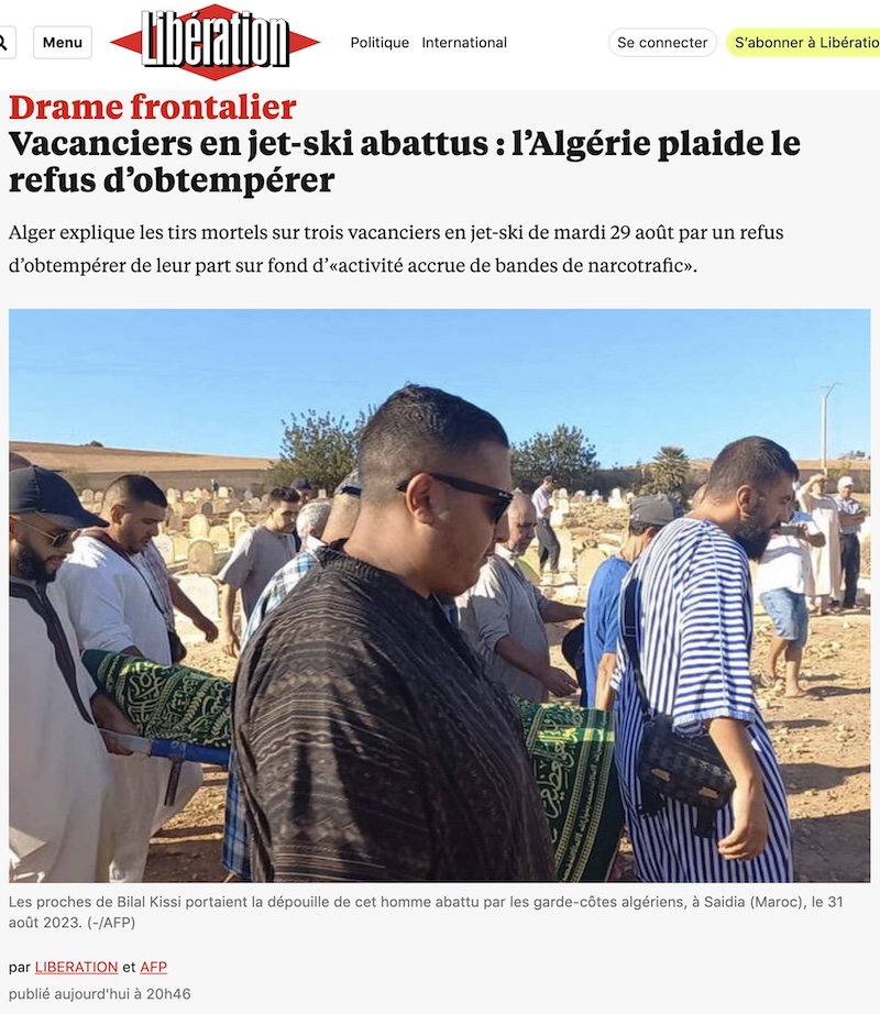 8月28日、アルジェリアに近いモロッコの海でバカンスに来てジェットスキーを楽しんでいたモロッコ人とモロッコ系フランス人が、アルジェリアの警備隊によって射殺された。
