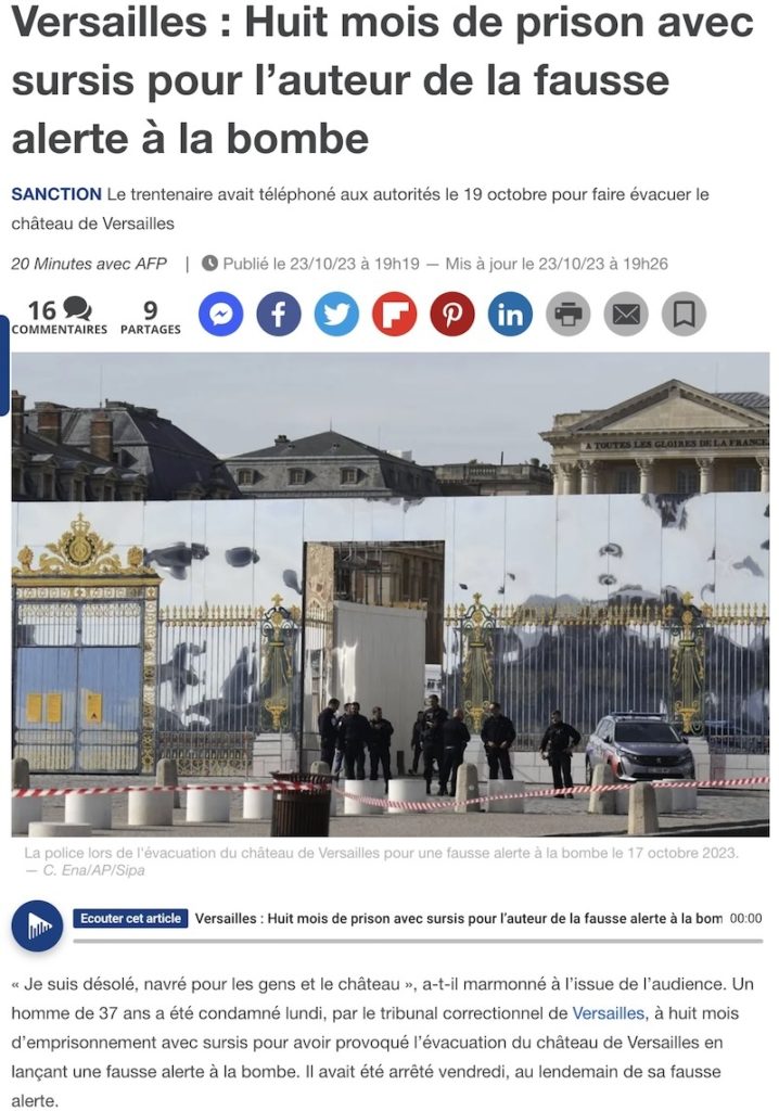 教育機関や空港、そしてヴェルサイユ宮殿が特にターゲットにされているが、昨日、ヴェルサイユ宮殿に爆破予告電話をした30代の男性に対し、即時出頭の裁判で判決が下った。