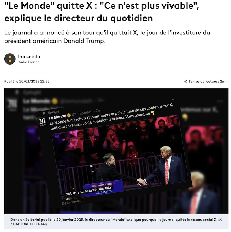 トランプ新大統領に近いイーロン・マスク氏の政治的な動向や、Xでの投稿の扱われ方に反発した。すでにLe Monde紙以外でも、Ouest France, Mediapart, La Voix du nordなどの新聞社や、Le Nouvel Obsなどの週刊誌もXをやめるとしている。