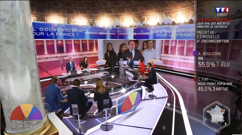 昨晩のフランス民放TF1の選挙特番の生放送。22時近く。左下にあるのが予想議席:赤・左派連合、黄・大統領勢力、青・右派、紫・極右。各テレビ局では、政治家たちが夜中まで、この後について議論していた。