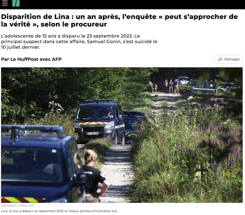 ちょうど1年前の9月末にフランスのメディアで大きく取り上げられていたのが、恋人に会いに行く途中で突然姿を消した15歳のリナの話題。フランスの田舎で、目撃者もなく、防犯カメラもなく、なんの手がかりもなく、当初は、当然のように恋人が疑われたり、地元の小さな街の怪しげな人たちに疑いの目が向けられたり。