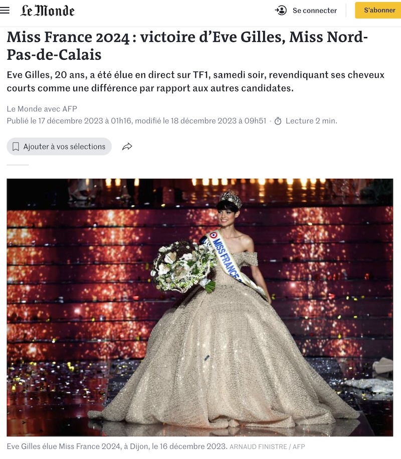 フランスの12月の風物詩の一つが、民放TF1でこの週末に放映されたミス・フランス。毎年、いろいろな話題になるが、今年は、ミス・フランス史上、初めて、ショートヘアの女性が優勝したと話題になった。