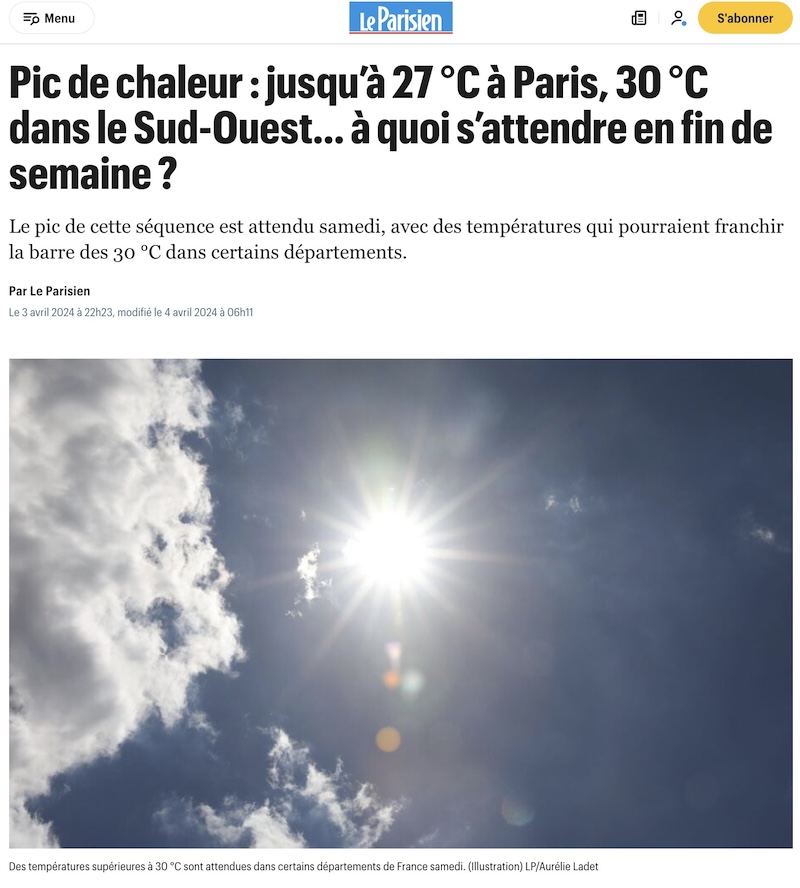 今週末はフランス全土で熱波が訪れる予報がでており、パリでは27度以上、南仏では30度以上になるという。しかし、今週から夏時間になり、日が長くなっており、異常気象とはいえ、夏を先取りのような天気はフランス人としてはどちらかというと嬉しいことで、テラスなどが賑わう。