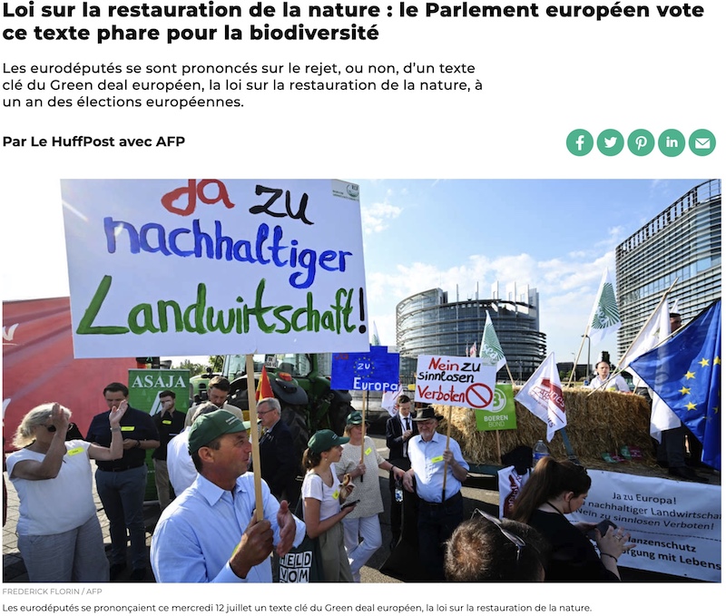 日本に関する話題はほとんど報じられず、大きく取り上げられていたのは、ヨーロッパ議会で、12日に採決されたエコシステムの回復法案だ。これはここ数ヶ月、賛成派と反対派(極右や右派系政党など)が激しい論戦を繰り広げていたり、デモ活動も行われていた。