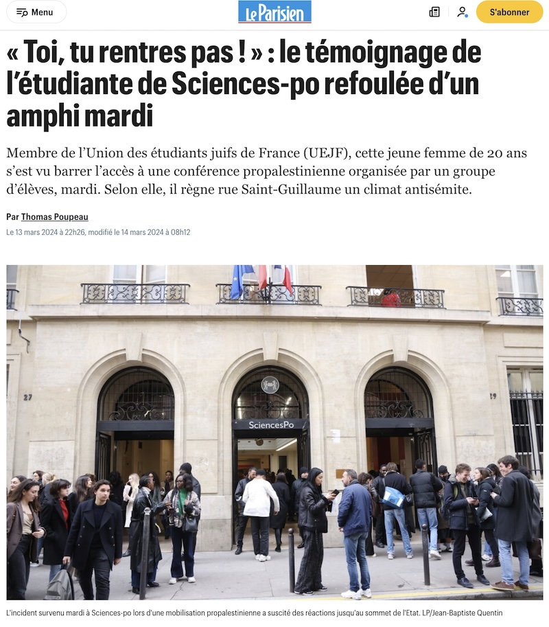 そこで、今週から大きく取り上げられているのが、パリ政治学院(通称、シアンスポ(science po)に関するもの。火曜日に、フランスのユダヤ人学生組合に属する20歳の学生が、パレスチナ支持の集会があった講堂に入ろうとしたところ、「お前は入るな」などと、暴言を吐かれたと証言。