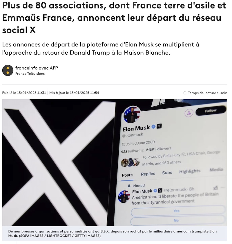 「ソーシャルネットワークXから離脱すると発表したのは、“避難地フランス”、“エマウス・フランス”など、80以上のアソシエーション」