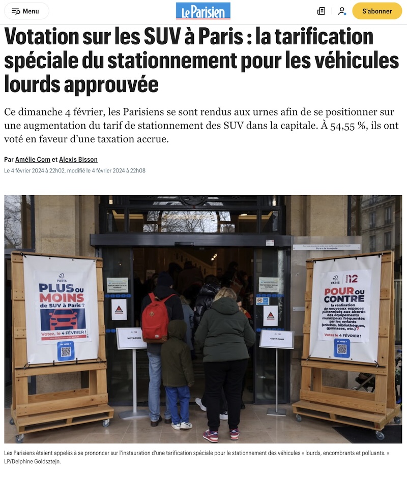 2月4日(日)パリで行われた投票は、いわゆるSUVと呼ばれる「重たくて、環境に悪く、かさばる」自動車をパリ市内に駐車する場合の料金を三倍にする法案への賛否をとうものだった。