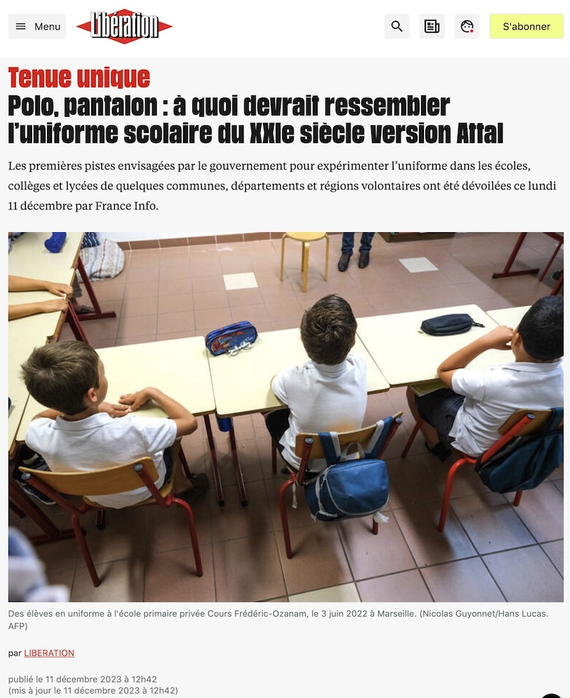 フランスで昨年あたりから議論されていた学校の制服。マクロン大統領も、「ジーンズとスニーカー」の制服もありうると発言したこともあったが、昨日、国営メディアFrance Infoが取り上げたところによると、2024年の新学期(9月)から、さらに早いところでは来年の3月から、新しい制服(厳密には「制服Uniforme」という表現ではなく「Tenu unique:統一された着衣」と表現されている)が試験的に小中高の一部で始まる。