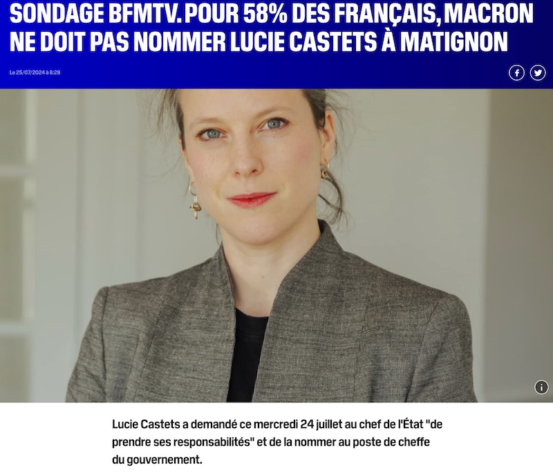 「BFMTV世論調査:58%のフランス国民は、マクロン大統領は、リュシー・カステを首相に任命するべきでないと考える」